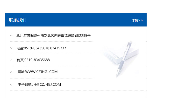 地址:常州市新北區友邦商務大廈1幢16、17層  電話:0519-85101652  傳真:0519-85112595  郵編:213022  網址:www.cz-jiayue_cn.xmsjyp.com  郵箱:xiajifengaa@163.com